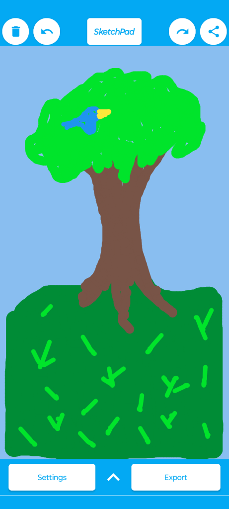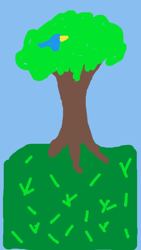 So I do my “finger painting” on a mobile app called SketchPad. It’s difficult to make exact marks with the tip of my index finger, so sometimes when I try to draw a small line I get a couple of dots instead. You can see a few of those in the grass. It’s also difficult to get the edges. The program tries to cancel the picture if I move along the edge in an outward motion. I should probably get a stylus for a finer image, but it’s fun the way it is. A tree, a bird, and grass look decent in finger paint.