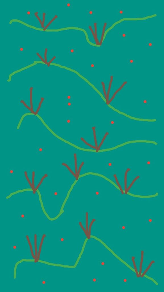 Today’s art is simple. SketchPad has ten basic colors. I chose four of those for this piece. The dark green background as a base against light green hills was the beginning. There are only two greens so I went with brown for the grass. I wanted to do ladybugs but the app isn’t detailed enough to make a custom pen. Perhaps I’ll pull it onto the computer and add more details. It’s fine for now. Enjoy it for what it is.