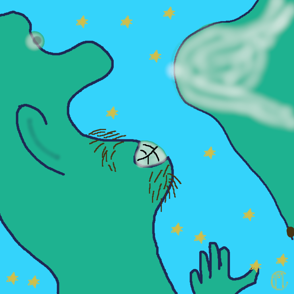 The first few lines formed a face. I added an eye and some teeth. He was looking up at something but the upper right was empty. I draw one more line and decided he was looking up at a woman. I’ve told you I’m obsessed with hands and I thought he might be reaching up to touch but after several atemps that hand you get is still pretty awkward. I defined the face and the woman a little more then decide to pencil in some stars to add a little magic. the artist mark was last as usual and used the same pencil as the stars.