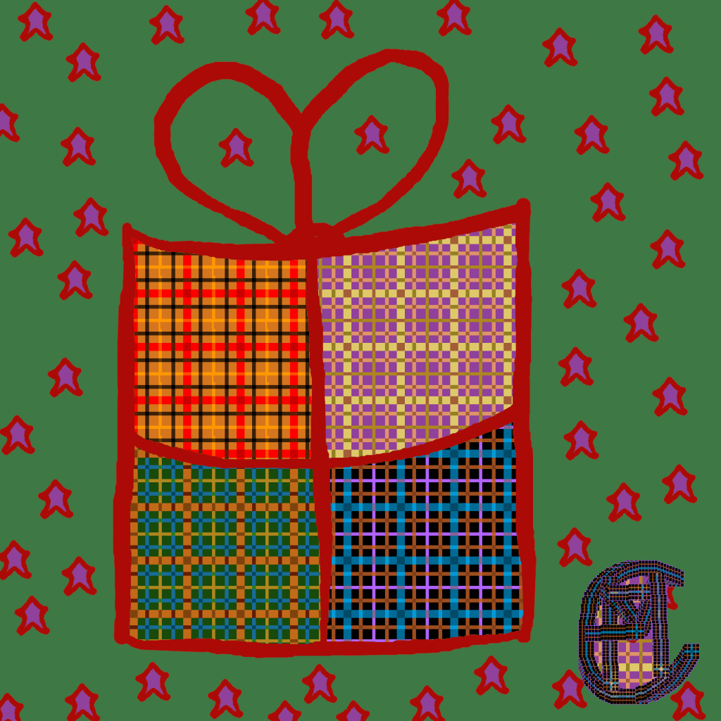 I’m still feeling Christmas-y today. Have a present in a red box with plaid frames. The background stars are for fun and to fill space. The artist mark is plaid a pencil with a plaid bucket fill. GIMP2