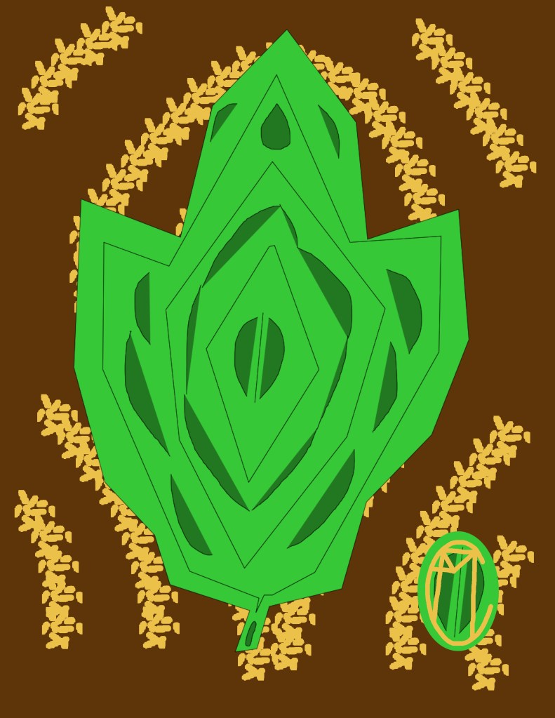 The foreground is a stylized green leaf made in InkScape with pen and nodes. It has a small stem on the bottom and three large points at the top. Inside there are alternating frames that become simple and simpler. The frames have bands of darker green half ovals. I created a background on GIMP2 of medium brown with gold confetti in roughly the shape I would overlay with the leaf. The green leaf contrasts the brown and gold behind it in without perfectly matching the shapes. An artist mark in the corner is an oval copied from the center of the leaf with my initials MFC in gold.