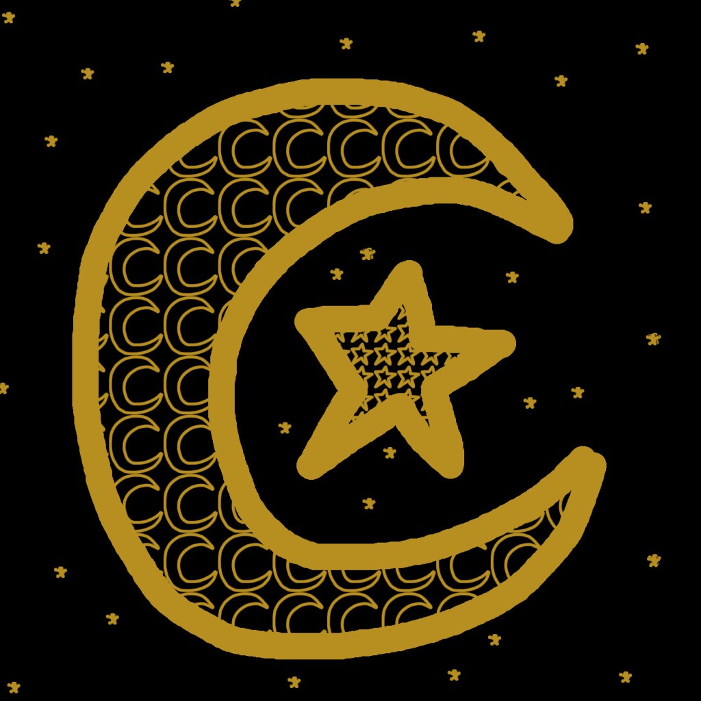 Simple and fun drawing and bucket fills on GIMP2. The principal image is a large outline of crescent moon with a smaller star outline in the arms of the crescent on a black background. The interior of the crescent is a regular series of smaller versions of the crescent, and the interior of the star is a regular series of smaller versions of the star. The remainder of the space is filled with much smaller stars of a different pattern placed at random.