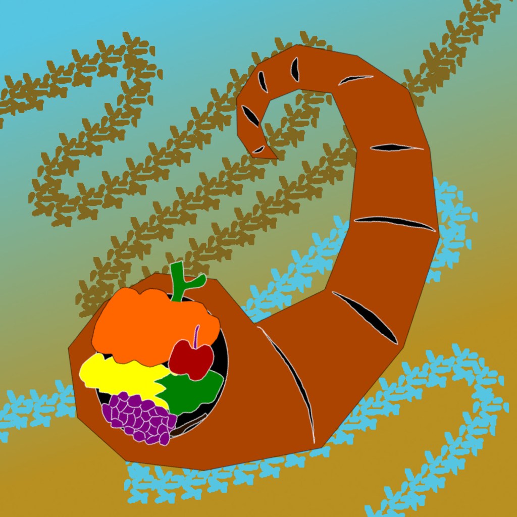 Today’s art is a Cornucopia in light brown with black creases made with pen and pencil of InkScape. The mouth has in descending order a pumpkin, an apple, and ear of corn, and a bunch of grapes. The background is a blue and gold gradient with confetti streaks in the opposite color from the base from GIMP2.