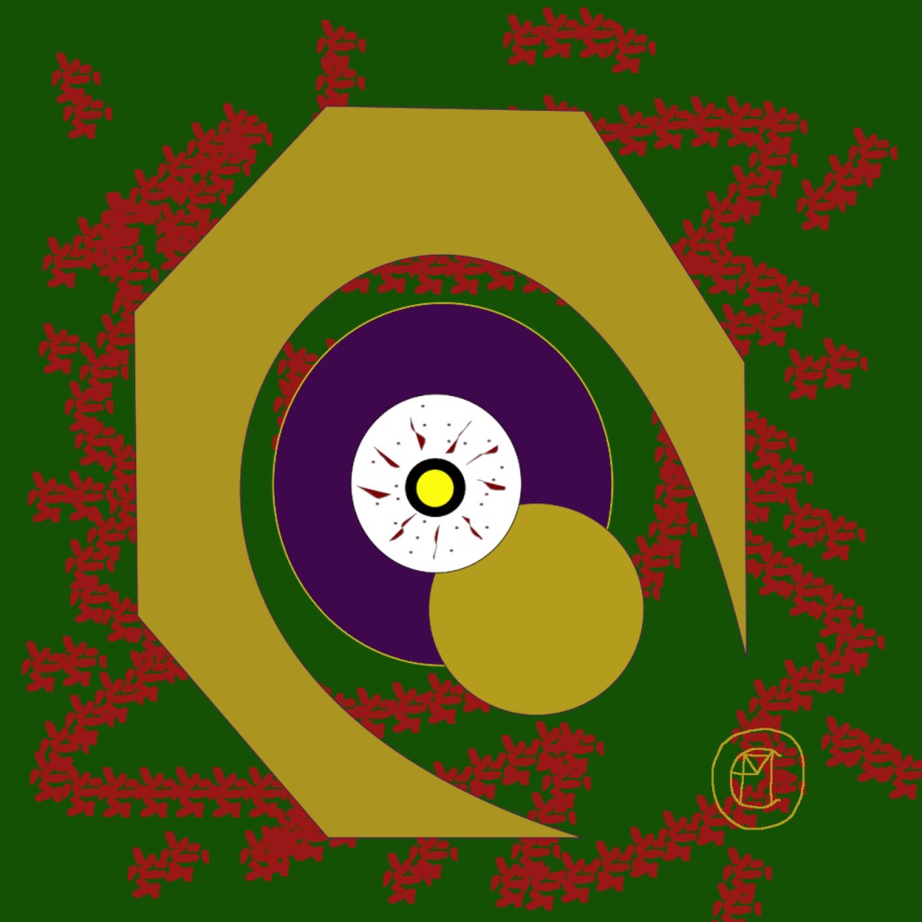 Today’s art is a white eye with blood red streaks and dots. It is surrounded by a purple sphere and has a golden sphere down and to the right which is under the eye but over the purple. The three spheres are inside a golden hexagon which also opens down and to the right. All of this was done in InkScape. The background is money green with blood read confetti and a golden artists mark made in GIMP2.