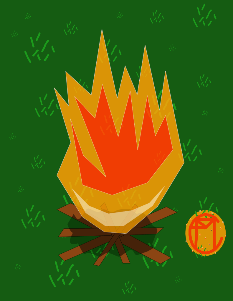 Toady’s art is a campfire. It started with a set of five crossed sticks at the bottom in pen. A thin transparent ash was placed on the sticks in pencil. The fire has a white outline with a slightly transparent orange for the majority of the fire with a whitish base and a reddish upper section. the background is dark green with light green grass in various sizes. An artist mark in orange and red is in the lower right corner with the grass showing through. There are several tiny version of the campfire’s main image dotting the mark. (InkScape/ GIMP2)
