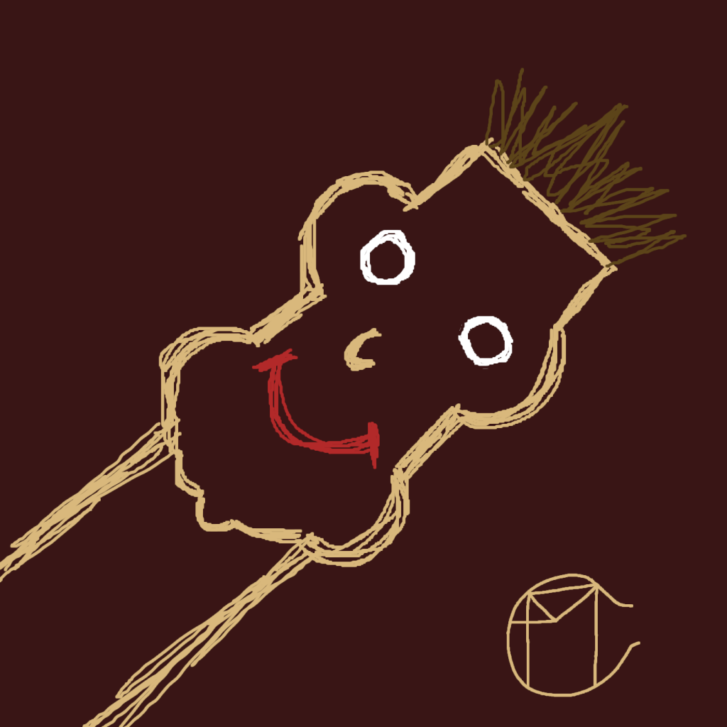 A long tan face with an even longer neck stretching from the bottom left corner to spikey brown hair in the top right corner. The eyes are white unfilled circles. The lips are a red smile with straight lined dimples. The nose is a single curve in the same color as the face. The background is burgundy. (GIMP2, artist mark)