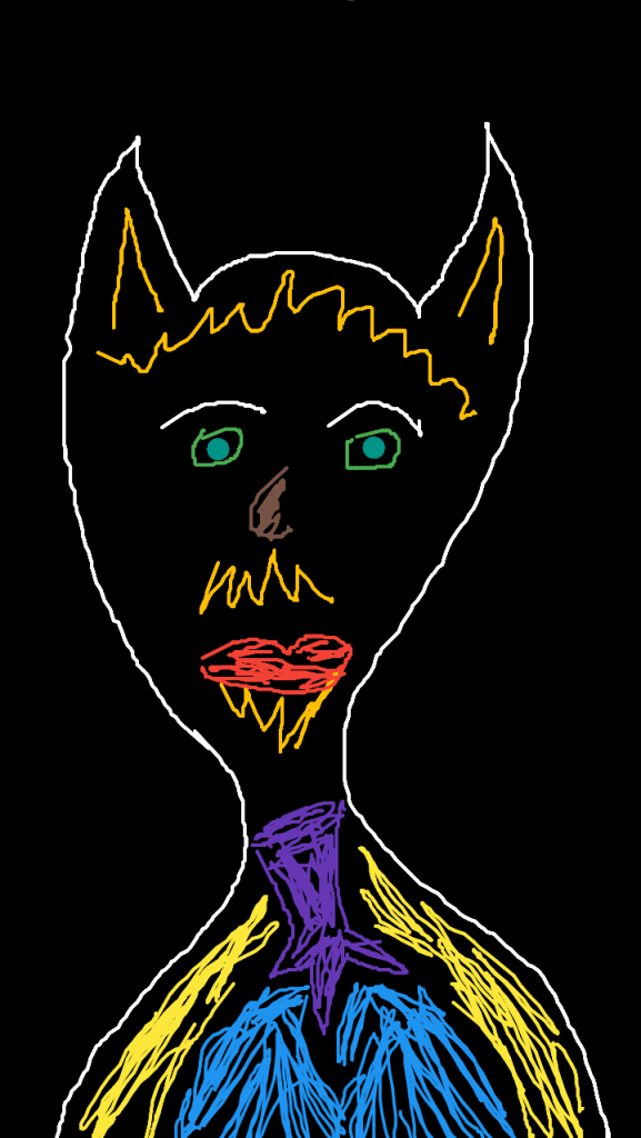 Today I challenged myself to make an image with all ten colors in SketchPad with the smallest brush. I cheated on the eyes but otherwise fulfilled my goal. The face doesn’t have a name and doesn’t have a story so you are welcome to make up your own. (SketchPad, finger painting)