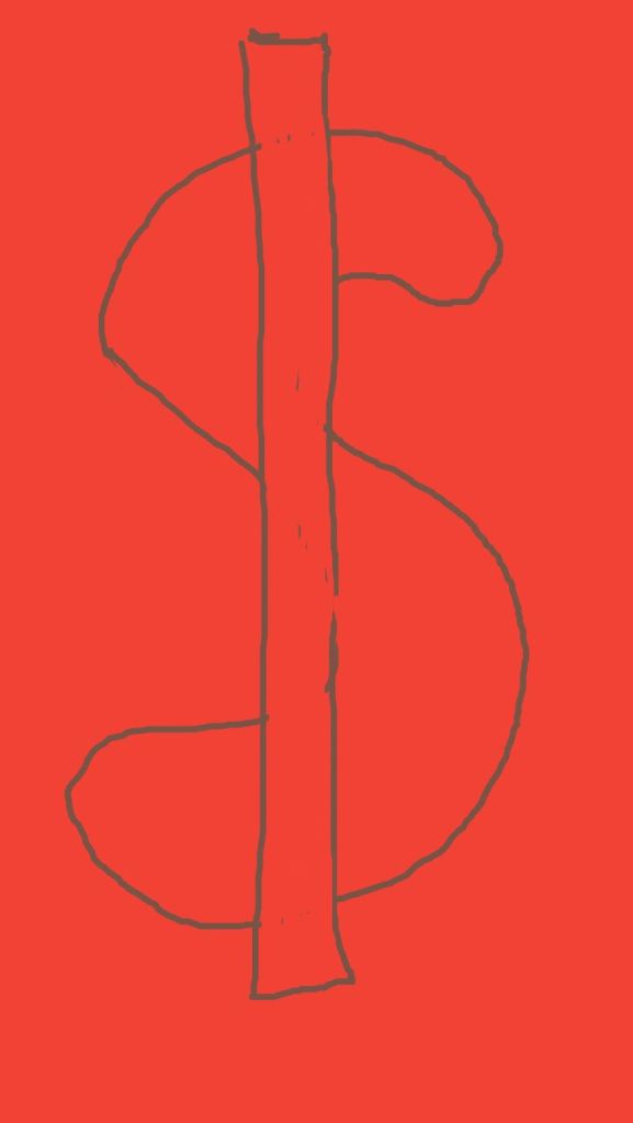When I was a teenager I heard a song on MTV. I don’t remember most of it, but there was a line that stuck. “What’s the color of money? Some may say it’s green. Me I know it’s red.” I think it was probably about the blood money that is still to this day earned by mining diamonds.and other so called precious gems. Today art is just a dollar sign in brown on a red background.